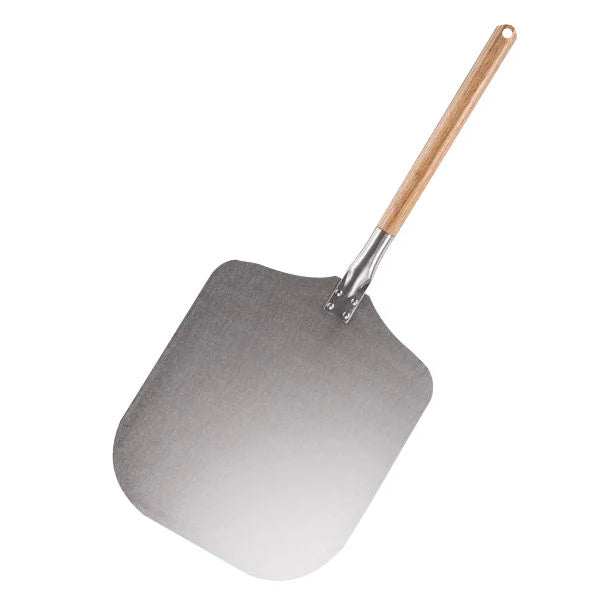 Pizza and bread peel Aluminum peel with wooden handle for baking. To safely remove or place pizzas, bread and dishes in your wood-fired oven. Dimensions: 65 x 30 cm